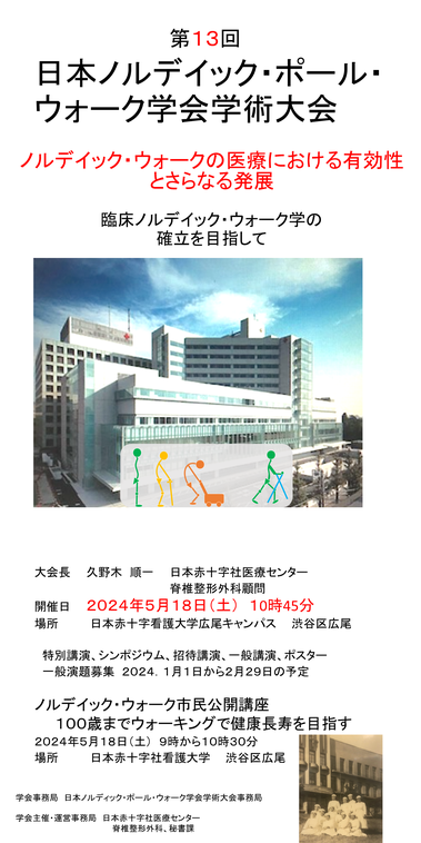 第13回日本ノルディック・ポール・ウォーク学会が、東京都渋谷区広尾に在る日本赤十字看護大学で華々しく開催された。会場には、約200名近くの医療関係者やメディカルノルディックウォークに関する関係者が集まり、活気に満ちた学術大会となった。